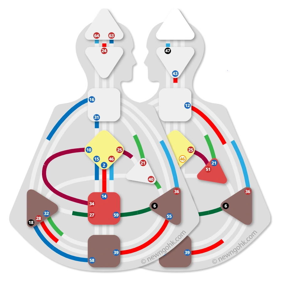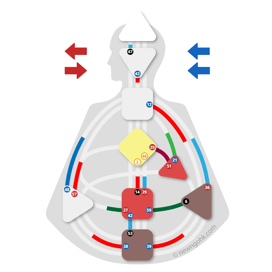 - 被編碼閘門的能量透過9個能量中心流動,並由36條通道相互連結,最終形成我們可體驗的「銳連繫」。